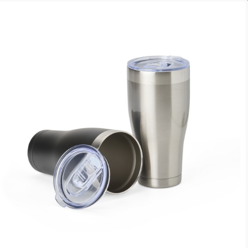 Copo térmico de inox com capacidade para 880 ml. Possui tampa com bocal e trava de segurança.